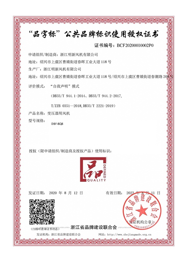 浙江明新風(fēng)機(jī)有限公司依據(jù)T/ZZB0351-2018《變壓器專(zhuān)用低噪聲冷卻通風(fēng)機(jī)》,在浙江品牌建設(shè)聯(lián)合會(huì)網(wǎng)站通過(guò)自主申報(bào),于2020年8月12日成功獲得“浙江制造”品字標(biāo)自我聲明授權(quán)證書(shū)。
